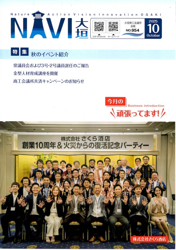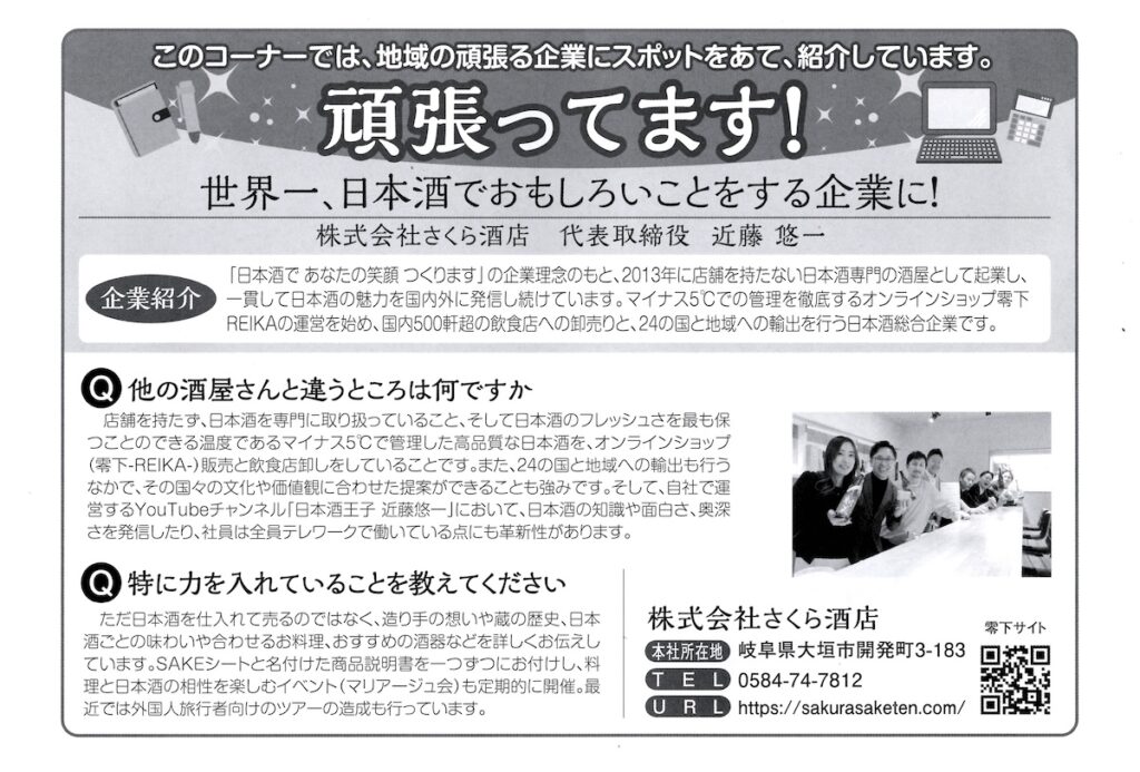 大垣商工会議所の会報誌「NAVI大垣」に弊社が掲載されました。 2025 10/07 ニュース 2025年10月7日 表紙 記事 ニュース よかったらシェアしてね! URLをコピーしました! URLをコピーしました! 【3/7(土)開催】第7回 SUSHI(鮨)×SAKE(酒)王道マリアージュ会 関連記事 【速報】ルクセンブルク酒チャレンジ2025 の受賞結果を発表! 2025年6月17日 【プレスリリース】スペイン初の日本酒展示会「Iberkanpai」に出展 2025年6月12日 【プレスリリース】「零響」を中心とした超高級日本酒マリアージュイベントを名古屋で開催 2025年6月12日 【CO₂排出量を実質ゼロに】岐阜本社の電気を地球に優しいエネルギーに変更しました 2025年3月31日 【ルクセンブルク酒チャレンジ2025】協力および出品募集のお知らせ 2025年3月31日 【さくら酒店×Zevero】サステナブルな日本酒文化の推進に向けた業務提携を開始 2024年11月18日 名古屋オフィス閉鎖、および本社統合のお知らせ 2024年9月20日 【台湾地震 寄付実施のご報告】668,000円をピースウィンズ・ジャパンに寄付させていただきました 2024年5月14日